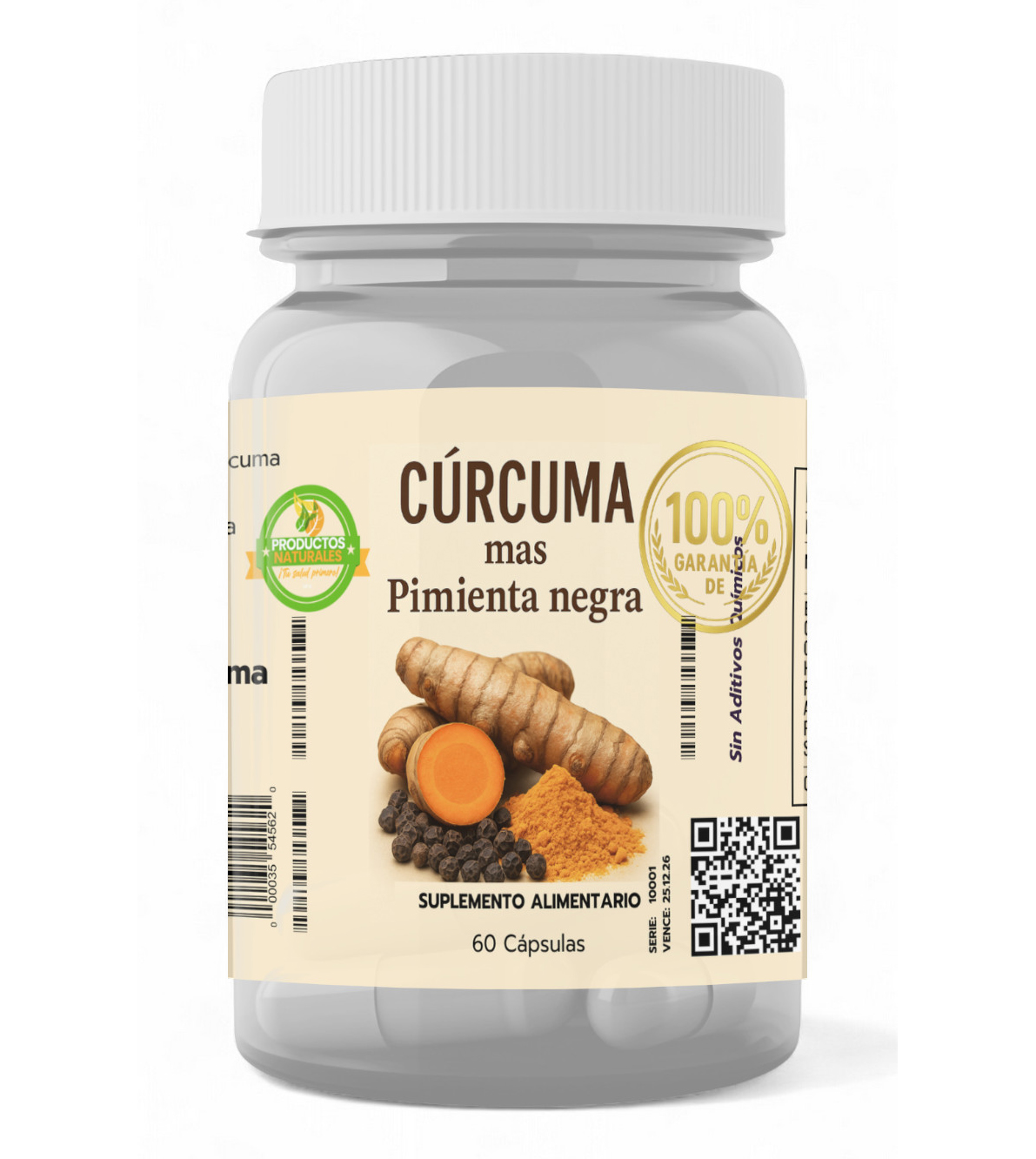 Suplemento natural con extracto de cúrcuma y pimienta negra, reconocidos por sus propiedades terapéuticas. La cúrcuma aporta curcumina, con efectos antiinflamatorios y antioxidantes, mientras que la pimienta negra potencia su absorción y contribuye a una mejor