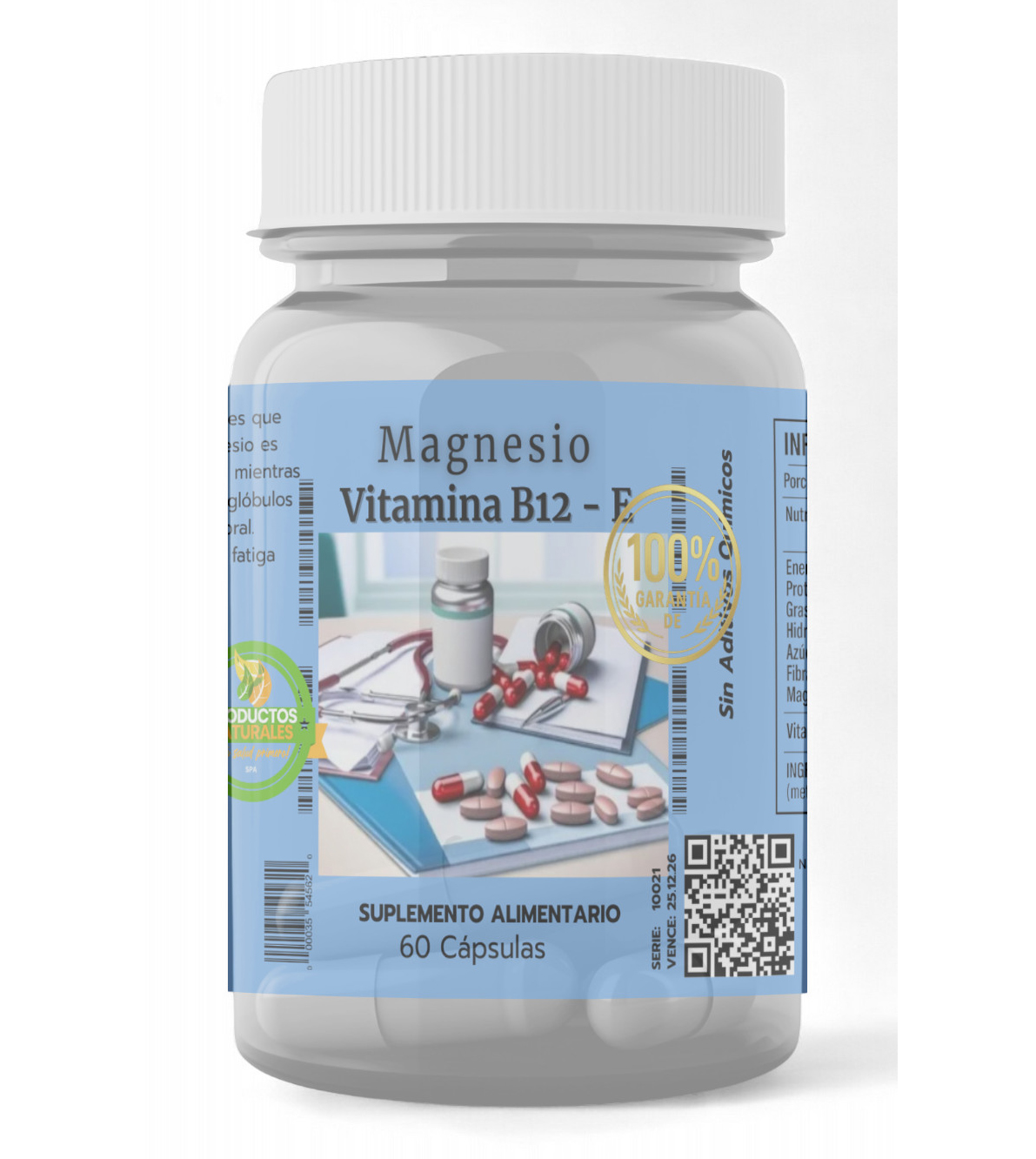 Suplemento que combina magnesio con vitamina B12 y vitamina E, orientado a mejorar el bienestar físico y mental. Ideal para quienes sufren estrés, agotamiento o alteraciones nerviosas. Su fórmula apoya el funcionamiento muscular, la salud ósea y el equilibrio emocional.