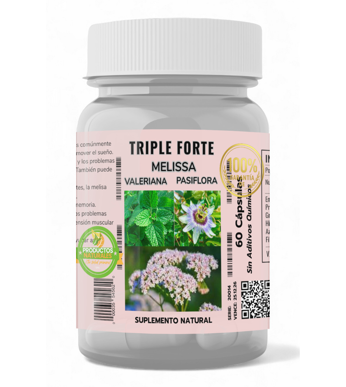 La combinación de melisa,valeriana y pasiflora, conocida como «triple», se utiliza principalmente como remedio natural para tratar el nerviosismo, la ansiedad y los problemas del sueño. Las tres plantas medicinales tienen efectos relajantes y calmantes que actúan sinérgicamente sobre el sistema nervioso.