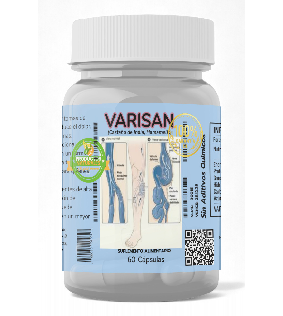 Suplemento natural formulado para mejorar la salud vascular, especialmente en casos de insuficiencia venosa. Varisan contribuye al confort y bienestar de las extremidades inferiores, aliviando molestias relacionadas con varices y fatiga circulatoria.